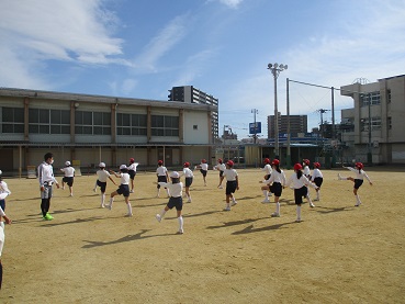 学期に1回、都島区から体育講師の方が派遣され、体育の学習をしていただいています。4年はミニハードル走の学習をしました。まずは、ハードル走のフォームにつながる運動や動きを、その場で立って行ったり、地面に座って行ったりしました。はじめのうちは、なかなか上手に体を動かせず、「なんのための運動か分からない。」という声も聞こえてきました。講師の先生からは、「やっているうちに、だんだんと出来てくるし、何の練習か分かってくるからやってごらん。」というアドバイスがありました。