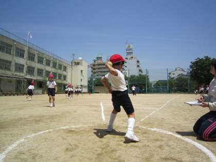 本日、全学年ソフトボール投げの記録をとりました。都会に住む子どもたちは、野球チームに所属している子ども以外、普段の生活でボールを投げる機会があまりありません。ボール投げは、投げるフォームによって記録が大きく違ってきます。本校では、休み時間に、友達どうしでキャッチボールをしたり、運動場のネットに備え付けてある投的シートめがけて投げる等の遊びを日常的に楽しめるよう、各学級に小さなボールを配布しています。ちなみに本日の最高記録は、45mです。