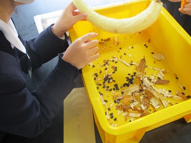4年の学習園で育てていた「へちま」が程よく枯れ、今日は種を取ってスポンジを作りました。パリパリと皮をむき、ポリポリと種を取って、チョキチョキとへちまを切って…子どもたちは楽しそうに協力して取り組んでいました。普段の生活では馴染みのなさそうなへちまですが、建物の壁に「緑のカーテン」として使われていたり、化粧水に含まれていたり、意外に私たちの生活に役に立っているようです。「食べられるんやで!」と、食用にもなることを知っている子もいました。