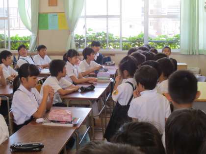 6年生の教室に、かわいい訪問者たちがやって来ました。土曜授業では、1年生と交流活動をする予定ですが、1年生たちが教室にあいさつに来ました。キラキラと輝く瞳と、はじけるような笑顔で、土曜日をいかに楽しみにしているかを大きな声で伝えていました。あまりの可愛さからか、6年生たちは吸い込まれるように1年生の様子を見ていました。ほんのひと時、優しさと温かさの詰まった心の交流ができたことと思います。さあ、次は6年生が気持ちに応える番です。土曜授業当日は大活躍を見せることを期待しています。