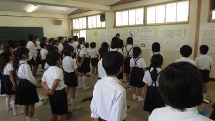 1時間目は3年生が初めて挑戦するリコーダーの“ソ”の音の吹き方を5年生に教えてもらいました。「上手だね。」「リコーダーの穴をしっかりおさえてごらん。」など具体的に声をかけ、指遣いやきれいな音の吹き方を3年生に優しく教えてくれる5年生。その気持ちに応えようと一生懸命練習する3年生。お互いの頭を突き合わせながら仲よく活動することができ、とても心温まる姿を見ることができました。