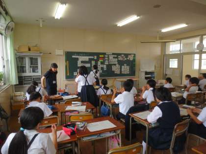 2時間目に、栄養についての授業をおこないました。まずは、「バイキング給食にチャレンジ」ということで、講師の先生が黒板に貼り出した約30のメニューの中から、子ども達が自由に選んでプリントに書きました。ラーメン、揚げパン、おにぎり…、食べ盛りの6年生でもあるためか、炭水化物が並びます。