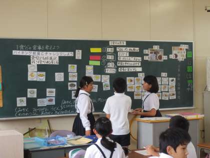 その後、主食、主菜、副菜、その他の食品のはたらきについて学習をし、バランスよく食事をすることの大切さを学びました。「自分の選んだバイキング給食は、はたしてバランスよくなっているだろうか。」を確認する段階になると、お互いのメニューを見て苦笑いをする子も何人かいました。