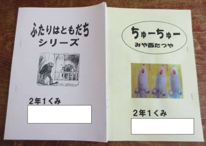 国語の「教科書上」に出てくるお話「お手紙」の作者「アーノルド・ローベル」のシリーズ作品「ふたりはともだち」と、「教科書下」の最後に出てくるお話「ニャーゴ」の作者「宮西達也」さんの作品「ちゅーちゅー」を全員に印刷しておうちでも読めるようにしました。ぜひ、おうちの方も一緒に読んで、登場人名物や心に残ったところを聞いてみてあげてください。