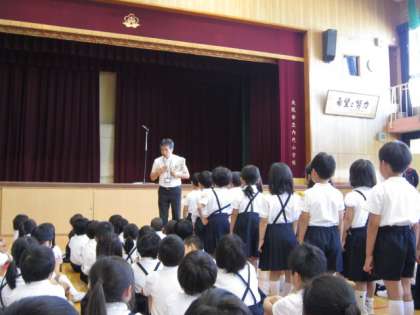 月曜の児童朝会で、子どもたちに「自分、友達、リーダー」というテーマで話をしました。1年生以外の子どもたちに、1年生時代を思い出させ、その時はいろいろなことができなかった自分でも、多くの人の支えによって成長できたことに気付かせました。その人たちに感謝するとともに、今度は自分たちが今目の前にいる1年生や下級生の良きお兄ちゃん、お姉ちゃん、良きリーダーとなれるよう頑張ろうと伝えました。