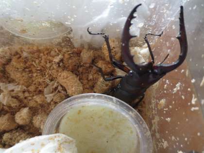 また、カブトムシ博士から「コクワガタ」と「ノコギリクワガタ」が届きました。前回は暑さと触りすぎでカブトムシを死なせてしまったので、今回は慎重に観察したいと思います。写真はノコギリクワガタです。
