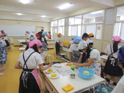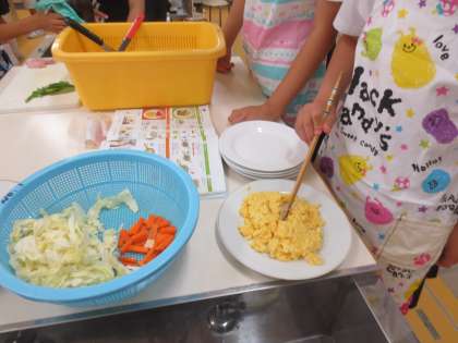 調理実習のようすの続きです。いろどりのよい3色の野菜が並んでいます。スクランブルエッグと野菜炒め、1つの班で2種類のメニューを作らなければなりません。役割を分担し、仲間と協力し、手際もよく進める必要があり、笑顔の中にも真剣な瞳が輝いていました。仲間と仕事をするという、調理すること以外の学習にもなったようです。