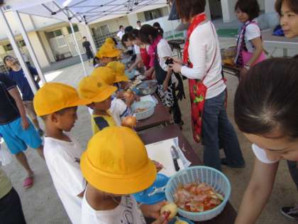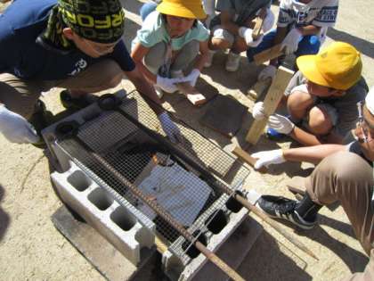 カレー作りがはじまりました。まずは、具材となる玉ねぎ、にんじんの皮をむき、小さく切っていきます。包丁の使い方に慣れていない子どもたちですが、PTAの方に教えてもらいながらカレーの具にちょうどよい大きさに切っていきました。その後、女の子はお米を研ぎ、男の子はかまど作りと火おこしを行いました。もうしばらくすると、ご飯の炊ける匂いやカレーの香ばしい匂いが届きそうです。