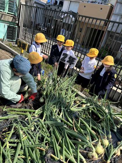 1年生が玉ねぎの収穫をしました。根が張ってなかなか抜けなかったので、管理作業員さんに助けてもらいながら収穫しました。