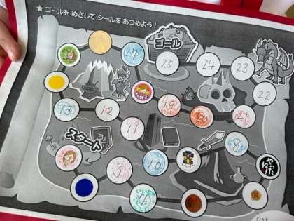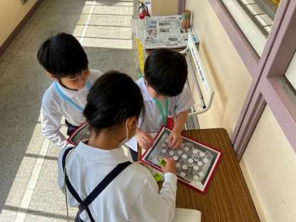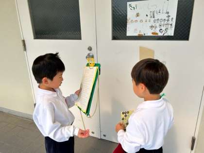 ポイントでは、2年生が教室の説明をしました。1年生は説明を聞き、カードにシールを貼ったり、スタンプを押したりします。2年生がしっかりと1年生をリードしていました。