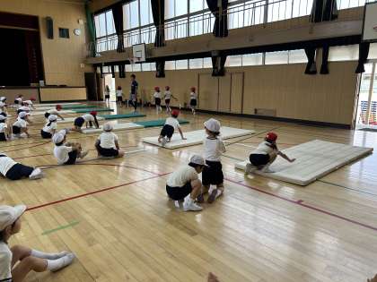 6月20日に区の体育指導がありました。1年生はマット運動を教えていただきました。背中をゴリラのようにまっすぐではなく、ダンゴムシのように丸くすると上手に転がったり、鉄棒で上手にまわったりすることができます。先生のお話をよく聞いて、いろんな動きにチャレンジしていました。