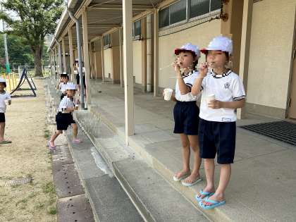 泥遊びでは、穴を掘って水をためたり、砂山をつくってトンネルを作ったりして遊びました。シャボン玉遊びでは、小さいやボン玉や大きいシャボン玉を飛ばしたり、ぶくぶくを泡立てたりして遊びました。