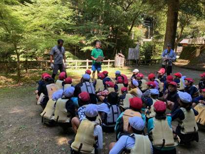 自然の川で遊びます。ライフジャケットを着て出動です。