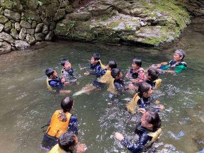 足がつかないとこもあり、ライフジャケットが威力発揮します。