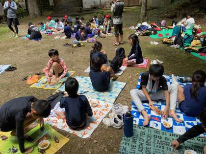 川遊びで腹ペコです。お昼はおいなりさんとからあげです。