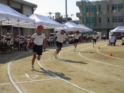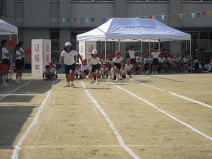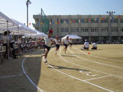 今年から徒競走、障害物走はセパレートコースで実施しています。1〜4コースに区別されたそれぞれのコースを走ります。気分は先日行われた世界陸上の時の様です。