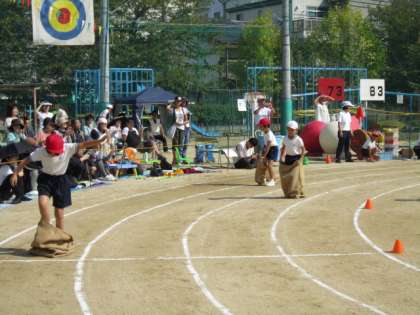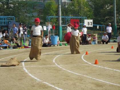 3年生の個人競技、障害物走の「JUMP&GO」です。ドンゴロスに苦戦する子も。みんながんばれ。ゴールはもうすぐだ。