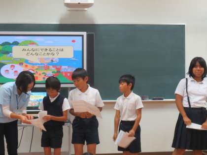 10月9日(金)にサントリーの「未来に引き継ぐために〜」をテーマに出前授業をして頂きました。地球上ですぐに利用できる水は0.01%しかないということにまず驚きました。資源には限りがあることを考えさせられました。事前授業でサントリーの工場の工夫を知り、自分が出来ることを考えました。