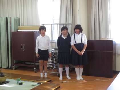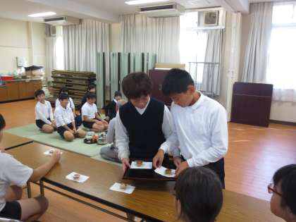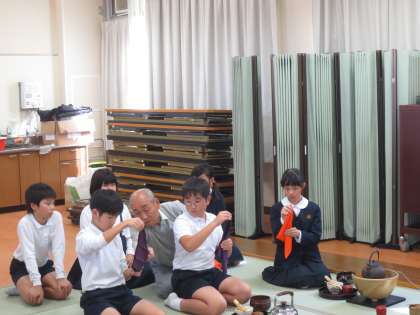 お茶の栽培活動に取り組んでいる6年生が、地域の山田先生のご協力で茶道体験をしました。お茶をいただくまでの作法にも、一つ一つ細かい動きがあり、「おてまえ」を体験した児童は真剣かつ必死という様子でした。作法も難しかったですが、もっとも大きな試練は正座だったようで、足のしびれとも格闘していたようでした。「おてまえ」の他にも、「おはこび」や「あいさつ」の作法についても教えていただきました。