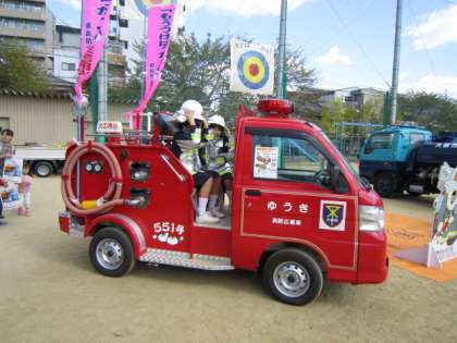 消防署からはミニ消防車が展示されました。子どもたちは消火服を着て消防隊員になった気分を味わっていました。