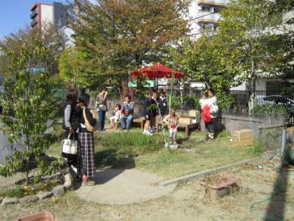 6年生は体育館でのお点前とともに、ビオトープで訪れる人にお茶の振る舞いをしました。季節によって様子を変えるビオトープ。保護者や地域の方々には、秋のビオトープの様子を楽しんでいただきました。