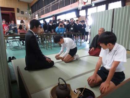 10月25日の「内代よいとこさ祭り」で、6年生は、茶道のお点前あり、ビオトープ喫茶の運営あり、学習発表ありと、大活躍しました。講堂では、短期間で覚えた茶道のお点前を披露し、実際にお客さんに抹茶を点てて飲んでいただきました。ビオトープ喫茶では校内を呼び込みして回り大盛況でした。学習発表では、4月から育ててきたお茶の取り組みを発表したり、リコーダーで2部パートに分かれて「木星」を演奏しました。楽しさの中から、多くのことを学んだ1日となったようです。