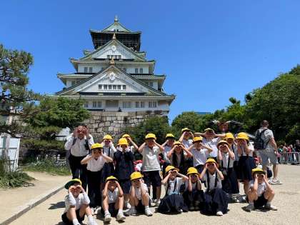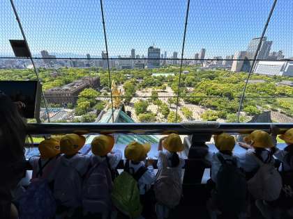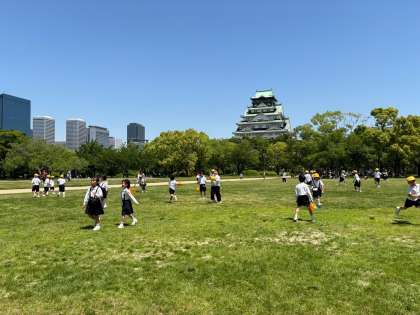お天気にも恵まれ、1.2年生で大阪城公園に行きました。天守閣の一番上まで上がると、風も気持ちよくきれいな景色を見ることができました。西の丸庭園で、お弁当やお菓子を食べたり、鬼ごっこやしろつめくさで花の冠を作ったりと楽しい時間を過ごすことができました。早朝のお弁当作りありがとうございました。