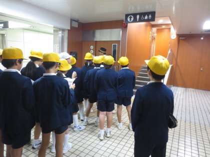 総合的な学習の時間で、ユニバーサルデザインの学習をしています。前回は、「アイマスク体験」の様子をお伝えしましたが、今日は、地下鉄の野江内代駅に見学に行ってきました。地域の身近な公共施設にも、「だれもが便利に使える工夫」がたくさんされています。お忙しい中、駅長さんが1時間近くも案内と説明をしてくださり、普段は気がつかないことをたくさん教えていただきました。「1番線と2番線では、アナウンスの声が女性と男性に分けられている」、「駅構内の案内板が触ると凹凸になっている」などの説明に、子ども達からも驚きの声があがっていました。