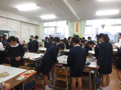 今回の学習は、調査結果を校内マップにまとめていくことで視覚化していく内容です。「どうまとめたらよいのか。」、始めは戸惑っていた様子でしたが、班で話し合ったり、他の班の工夫を参考にしたりし、シールや付せん、色マジック、色画用紙などを活用してマップに調査結果を書き込んでいました。調査の場所ごとに色分けする班、危険の度合いを色でレベル分けする班など、試行錯誤する中でいろいろな工夫が生まれてきました。子どもたちの持つ、考える出す力、協力してアイディアを生み出す力に感心しました。