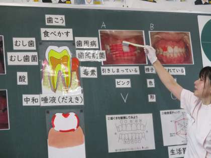 本日6年生が歯と口の健康教室を実施しました。学校歯科医の指導のもと、染め出しによる磨き残しの確認や歯周病について学びました。この学びを生かし、歯を大切にしてほしいと思います。