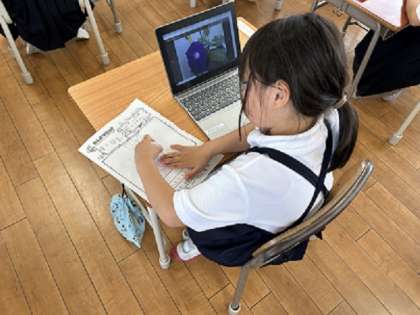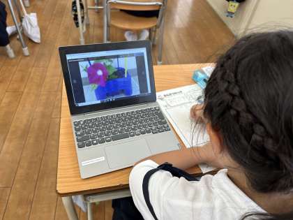 4月から育てていたアサガオが、7月に入りたくさん花が咲き始めました。外は暑いのできれいに咲いている様子を各自写真に撮り、教室で撮った写真を見ながら観察カードを書きました。パソコンの扱いにも慣れてきています。