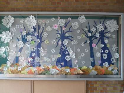 12月の玄関掲示は6年生が作成しました。踏みしめる落ち葉の音を聞きながら、ふと空を見上げるとフワフワと雪が舞い降りて…、秋から冬への移り変わりを表現できたと思います。