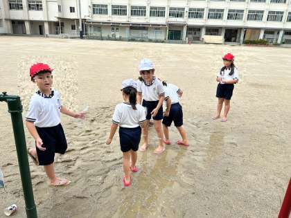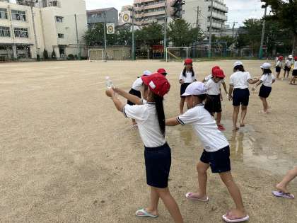 生活科で水遊びをしました。ペットボトルの蓋に穴をあけて作った水鉄砲で遊びました。こまめに水分補給をしながら、牛乳パックや紙コップで作った的に水を当てたり、地面などに水をまいたりして遊びました。活動を終えてから、「ペットボトルを強く押すと遠くまで水がとんだよ」、「水が少なくなったら下に向けると水が出るよ」などと気付いたことを発表し、振り返りをしました。