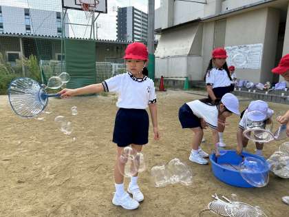 1年生が生活科の学習でシャボン玉遊びをしました。いろんなシャボン玉ができて楽しく活動することができました。