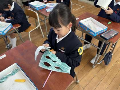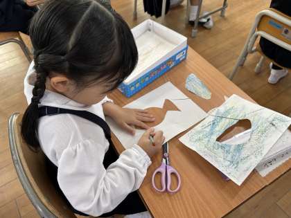 先日、こすりだしをして模様がでてきた和紙を使って、作品制作をしています。鉛筆でシルエットを描いて、線に沿って切っていくと…??どんな世界ができるのか楽しみです!