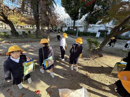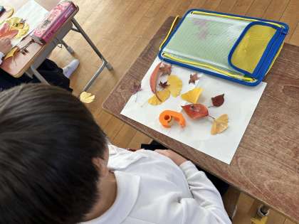 生活科の学習で秋を見つけに高殿南三公園と内代公園に行ってきました。2つの公園をまわって、黄色や赤に色づいたイチョウやサクラ、モミジなどの落ち葉を拾ってきました。拾ってきた落ち葉や木の実などをならべて、いろんな形をつくりました。