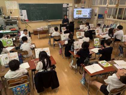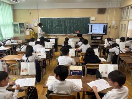 授業では、黒板だけでなく、大型モニターも使って学習を進めています。