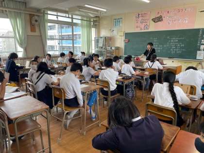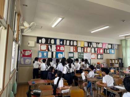 お世話になったランドセルへの思いを表現した絵画が教室に展示されています。今日は、その絵画を鑑賞しました。