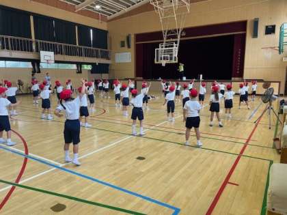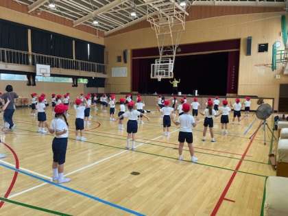 お天気がいいのに、朝から雷注意報が出て、楽しみにしていた水泳学習が中止になりました。そこで、1年生は講堂で音楽に合わせて体操をしています。この体操は、水泳学習で挑戦する体操だそうです。音楽に合わせてノリノリの子どもたちでした。