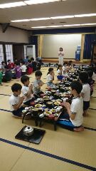 これから待ちに待った夕食です。昨年の林間では食事の取り方が課題として残りましたが、さて今年の夕食はどうでしょうか。林間の時と違って一人一人お膳で出されています。