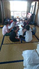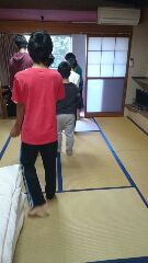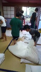 子どもたちの活動が始まりました。眠い目を擦りながら布団の片付けと洗面を行っています。