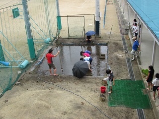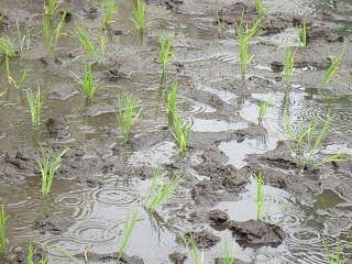 ポツポツと雨の降る中、JAの方に教わりながら田植えを行いました。あいにくの天候に実施するかどうかが危ぶまれましたが、子どもたちは明るい笑顔で作業をしていました。泥に足がはまって動きにくくなったり、植えた苗が倒れそうになったり、あちらこちらで子どもたちの声が飛び交っていました。お米を得るためにはたくさんの工程が必要であること、天候に左右されながら苦労して作られていることなど、体験を通していろいろなことを学んだことと思います。