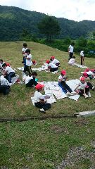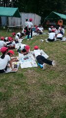 昼食の片付けが思ったより長くかかり、やっと次の活動である焼き板づくりに取りかかりました。芝生の上で寝そべって作品創りをするのも気持ちがいいものです。