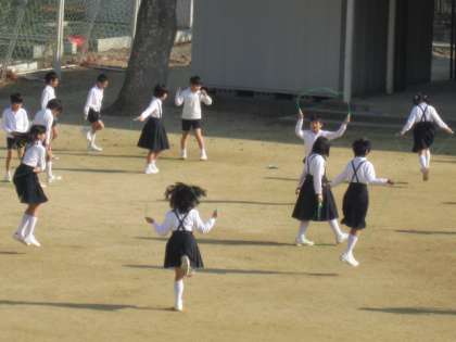 今週は、なわとび週間です。2時限目終了後の内代タイムには、児童たちがとび縄を持ち、運動場に集まってきます。短縄で、一人で跳ぶ子、友だちと二人で跳ぶ子、長縄で大勢の友だちと跳ぶ子、いろいろなかたちで縄跳び運動をしています。一人一人が縄跳びカードをもとに、それぞれの課題に挑戦しています。