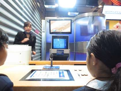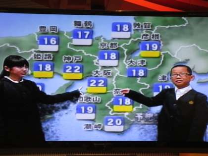 どうして画面上で合成されるのかをもっと詳しく知るために、今度はお天気キャスター体験へ。代表2名がキャスターになり、天気予報を行いました。「なぜ、後ろの壁は青色なのに、画面上ではいろいろな情報が出てくるのか」など、クイズ形式で教えてもらいました。