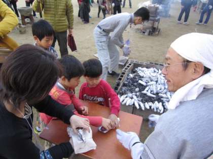 もちつき大会の写真の続きです。連合女性部の「ぜんざい」、PTAによる、「本格的な石焼いも」、「お雑煮」も大好評でした。