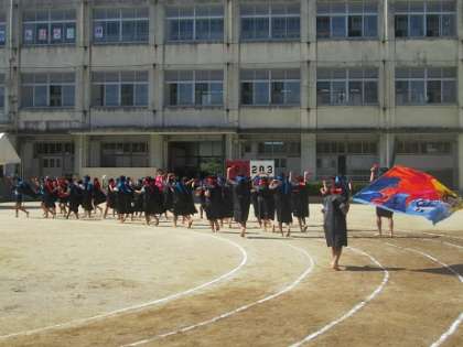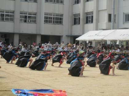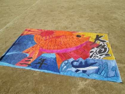 難しい動き、隊形移動に挑戦した3・4年生。大漁旗も自分たちで作りました。