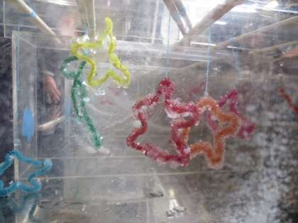 先週、ミョウバンをた〜っぷり溶かした水溶液の中に自分たちで好きな形に曲げたモールを入れて1週間置くと…
