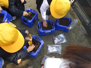 1年生が生活科の学習で「チューリップ」の球根を植えました。夏まで「あさがお」を育てていた鉢を整え、土を入れてから球根を1ずつ植えていきました。自分が受け取った球根を宝物のように大事に大事に扱っていました。春にはどんな花が咲くのでしょうか。