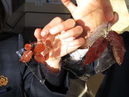 正門に立って登校指導中、すでに登校して運動場で遊んでいた3年生の女子2名が目を輝かせ、何やら大事そうに持って「校長先生!」とやってきました。うれしそうに見せてくれたのは「落ち葉を閉じ込めた氷」です。砂場を覆うカバーの片隅で発見したそうです。自然が作り出した芸術品です。それを見過ごさずに心動かされ、わざわざ見せに来てくれた子どもたちの感性にも感動しました。氷は冷たかったですが、心はポカポカ温かくなりました。